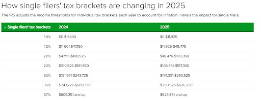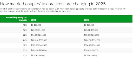 For instance, the new threshold for the 10% tax bracket for married couples filing jointly will rise to $23,850 in 2025, a 2.8% increase from its 2024 threshold of $23,200.